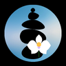 Brand logo of unanomalize, full black square, centered big skyblue circle, a black cairn, a white orchid
